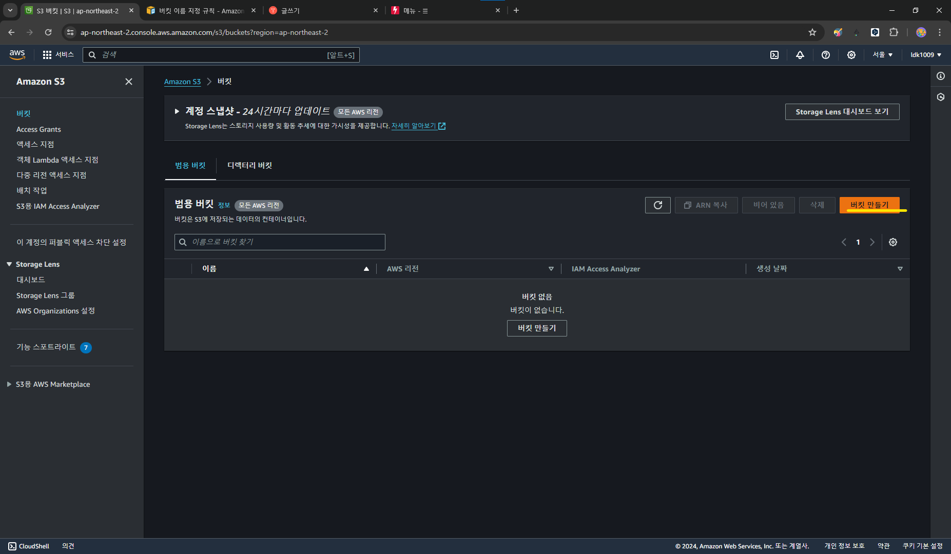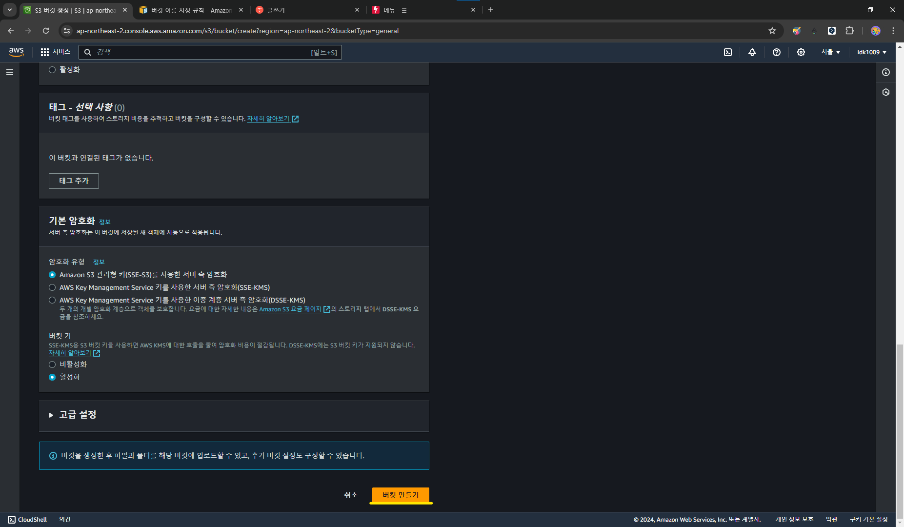 설정을 마쳤다면 `버킷 만들기`를 클릭합니다.