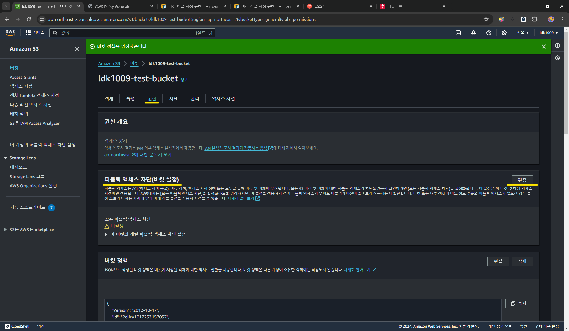 버킷 정책이 추가된 것을 확인할 수 있습니다.