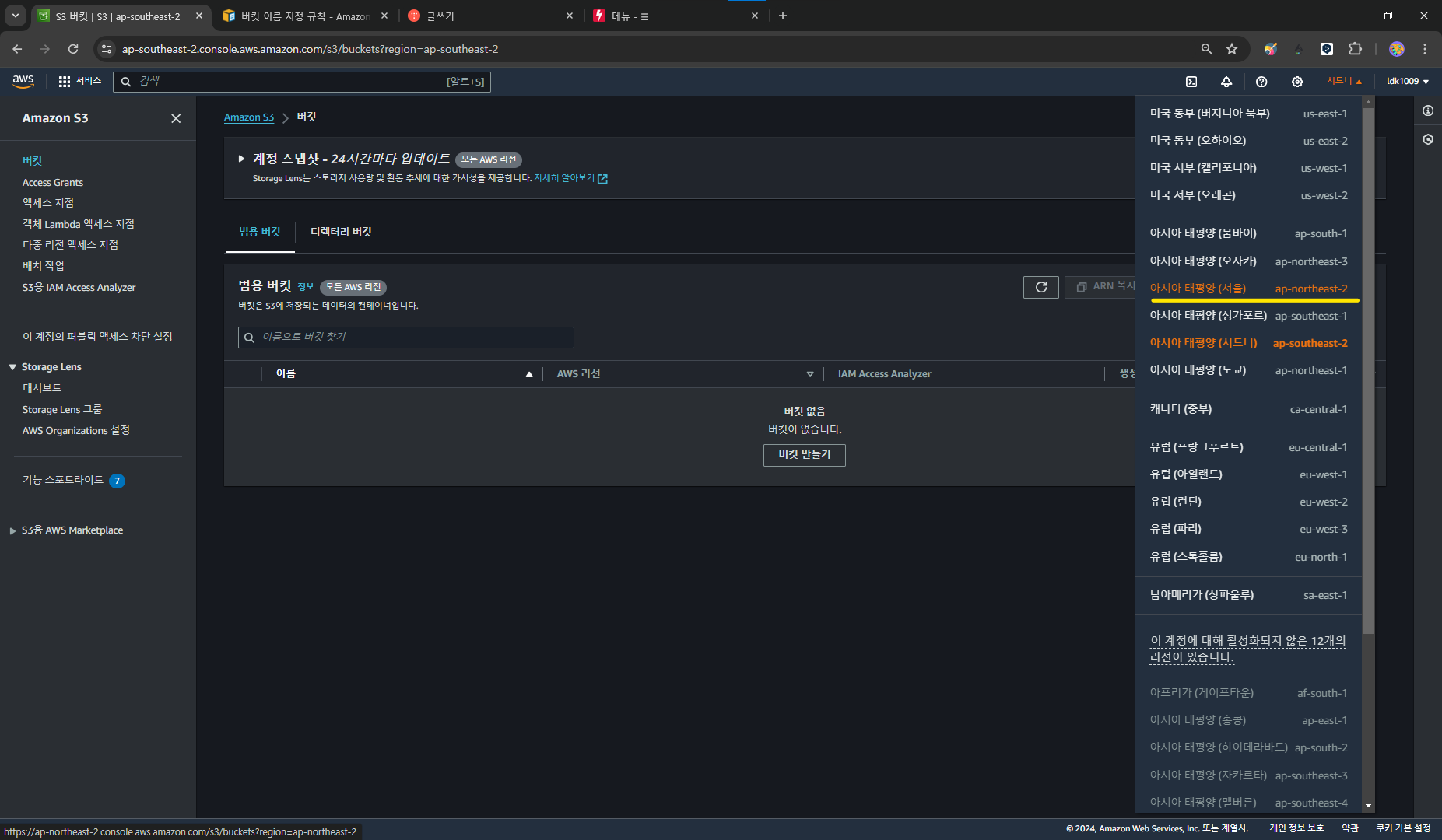 (버킷 이름은 고유해야하며 대문자 사용 불가능, 하이픈(-) 사용 가능 )