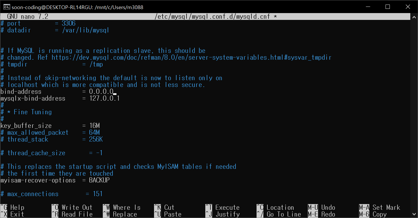 키보드 방향키 또는 찾기(Ctrl + W) 를 통해 bind-address를 찾아 0.0.0.0 으로 변경합니다.