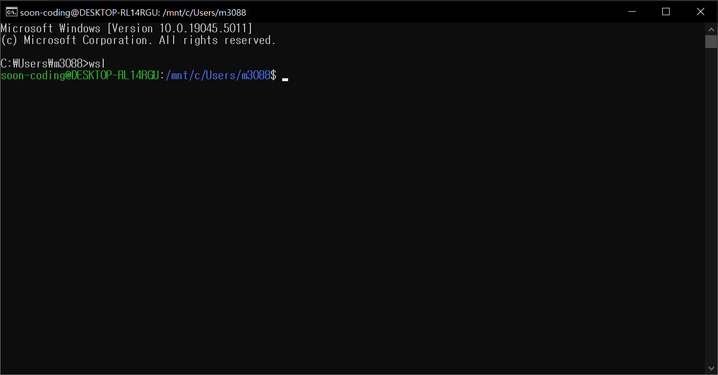 CMD에서 위 명령어를 입력해 WSL 환경(리눅스)을 실행합니다.