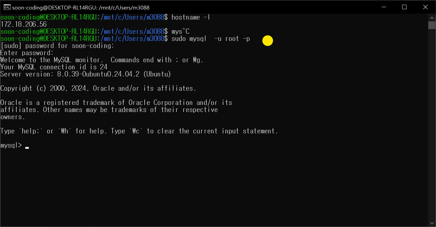 CMD를 실행시켜 위 명령어를 통해 WSL에서 구동되고 있는 MySQL 서버에 원격접속합니다.