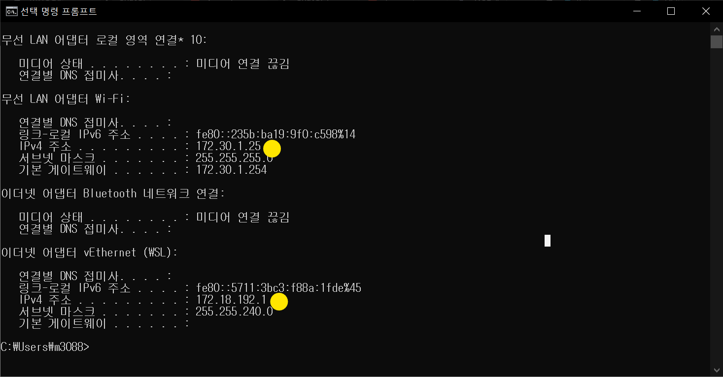CMD에서 위 명령어로 윈도우 IP와 어댑터 IP를 확인할 수 있습니다.