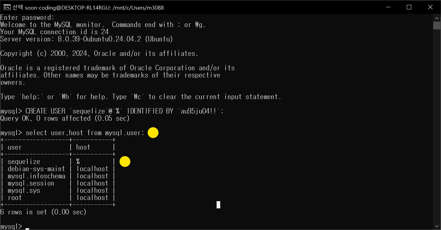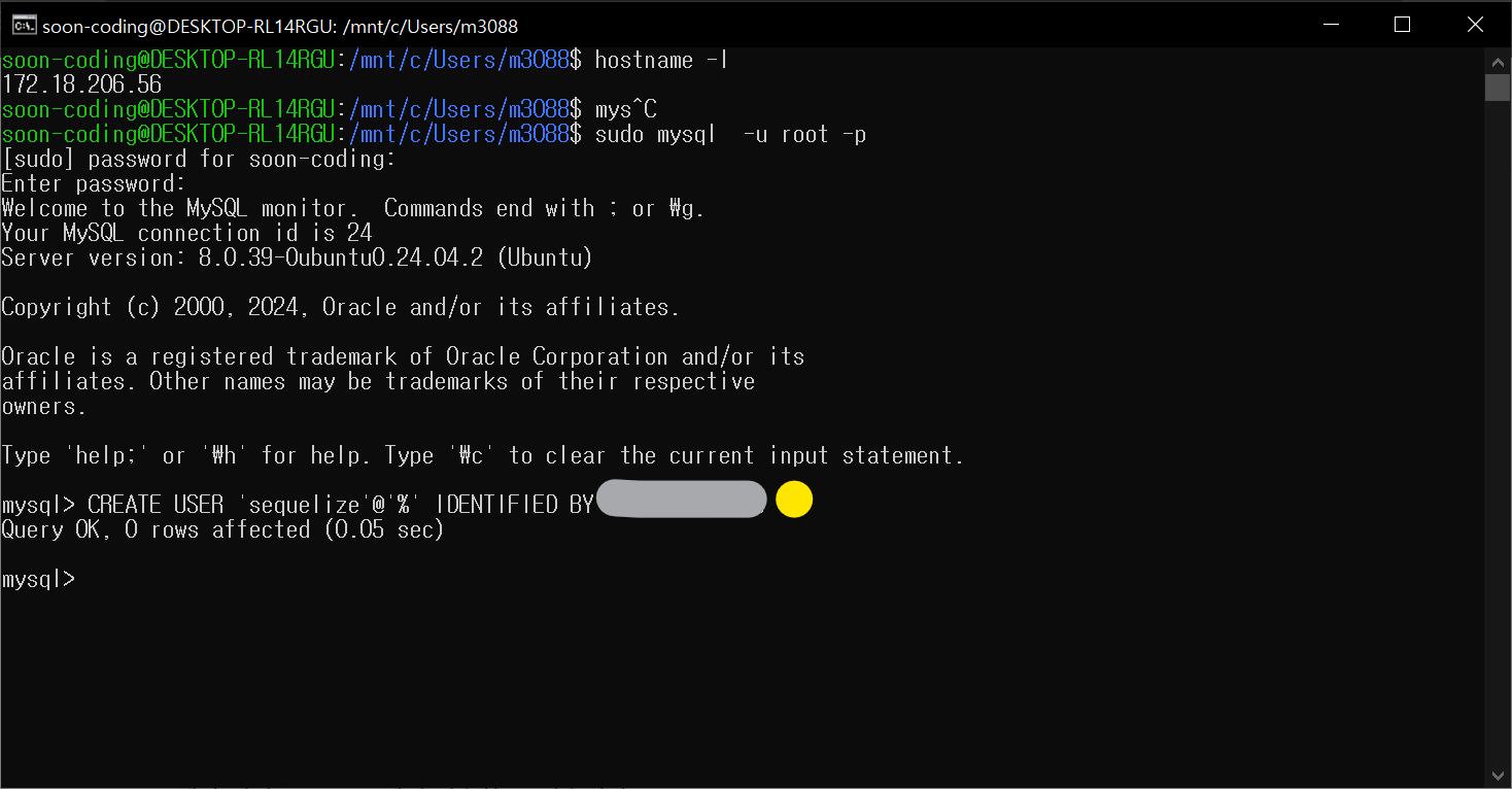 ex ) mysql> CREATE USER 'sequelize'@'%' IDENTIFIED BY '1234qwer!!';