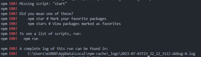 [React] npm start 오류 (npm ERR! Missing script: "start"npm ERR! npm ERR! Did you mean one of these?npm ERR! npm star # Mark your favorite packagesnpm ERR! npm stars # View packages marked as favoritesnpm ERR! npm ERR! To see a list of scripts..