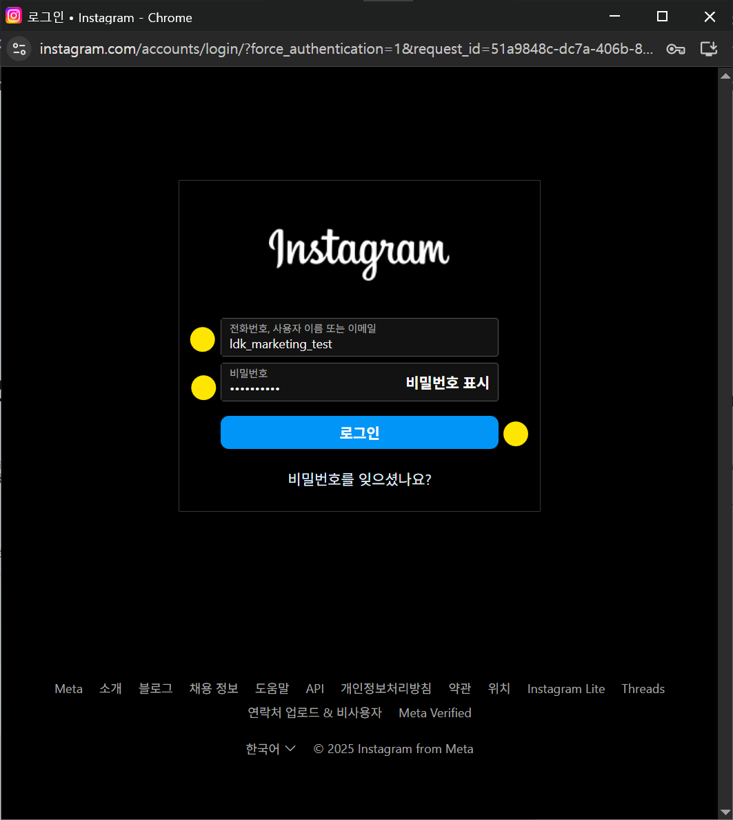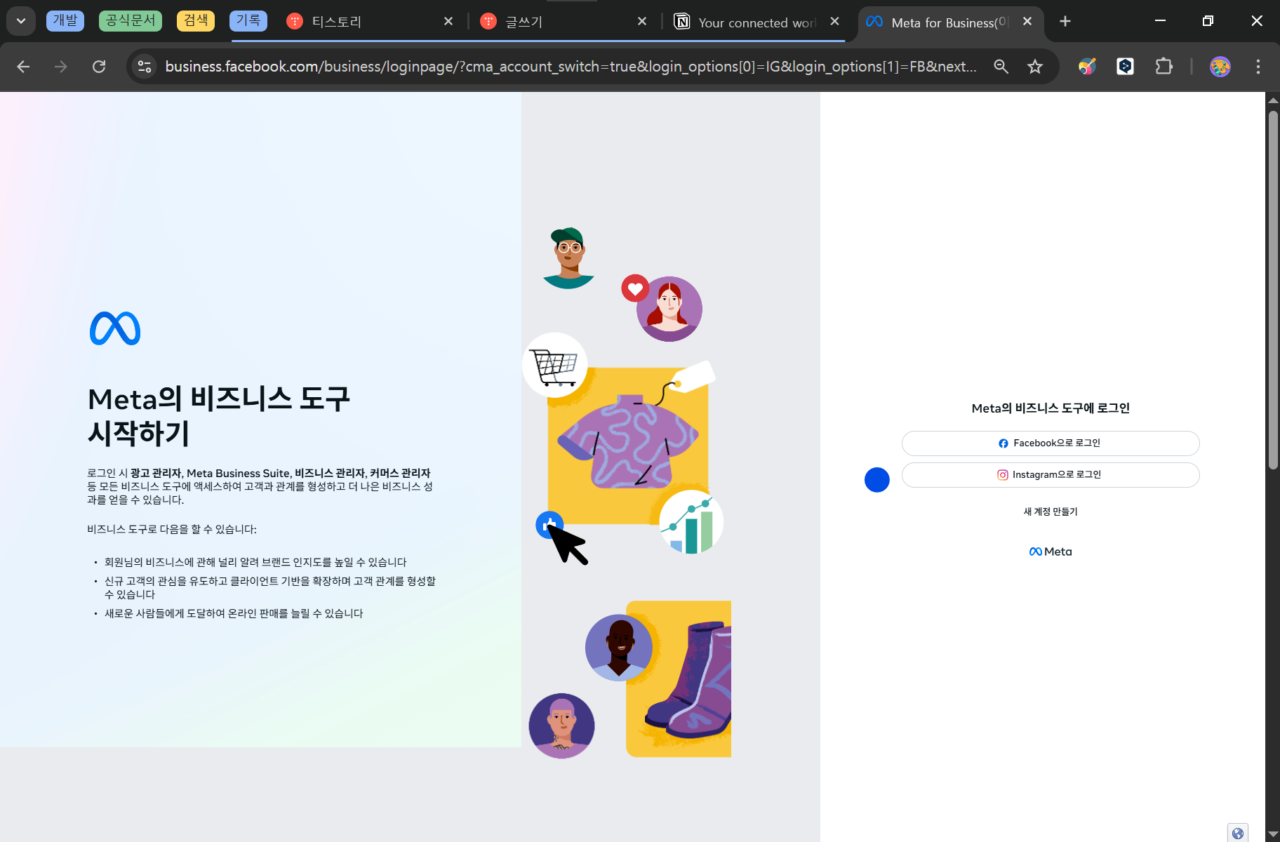 이 때, 만약 로그인 오류가 발생한다면 비즈니스 계정으로 전환이 되지 않아 오류가 발생했을 확률이 높으니 아래 글을 참고하세요.