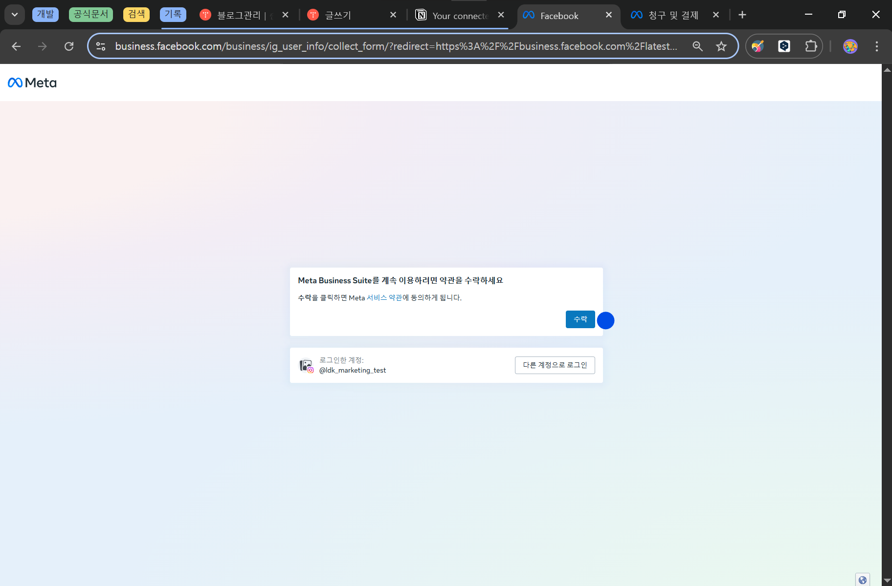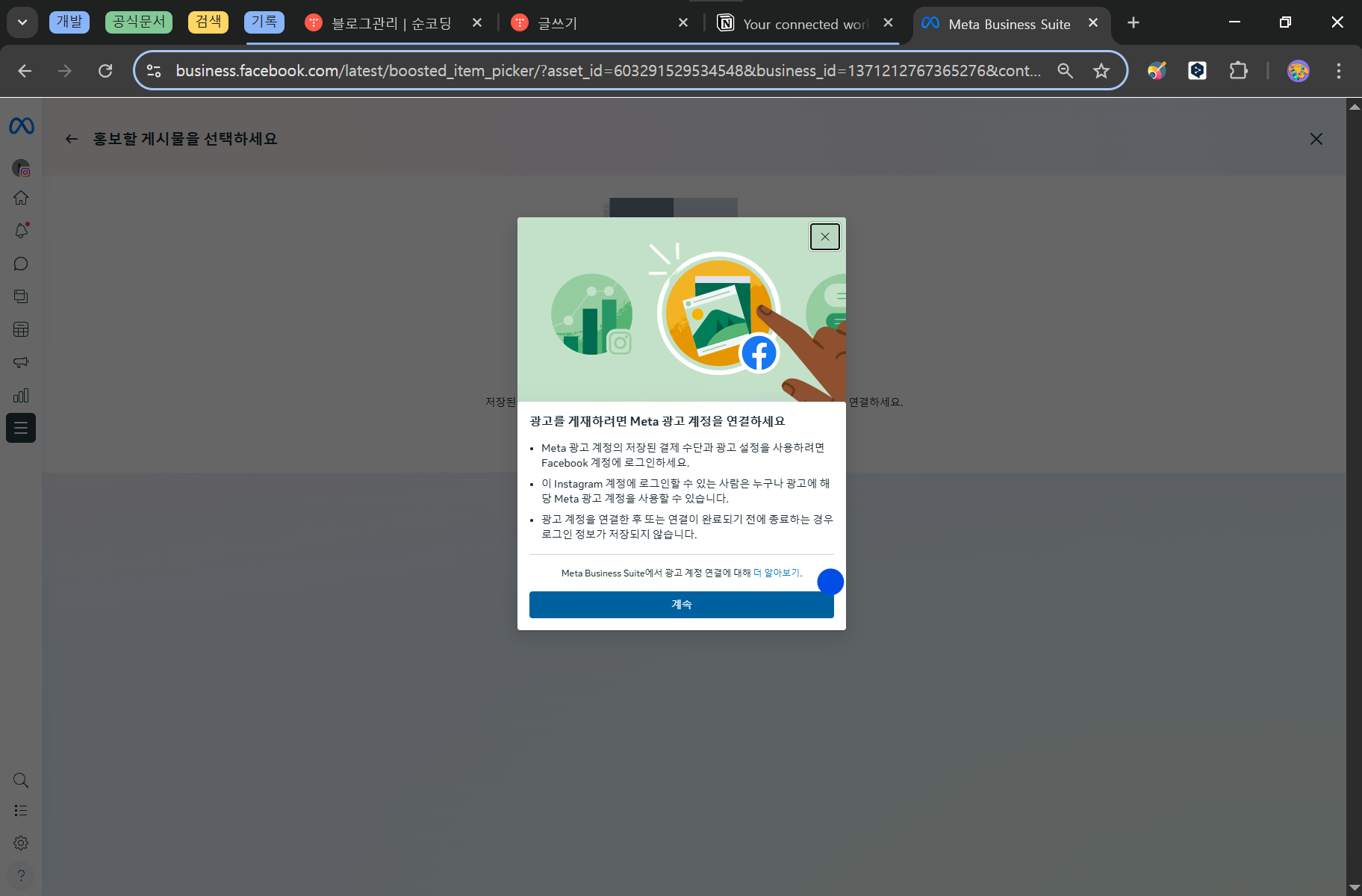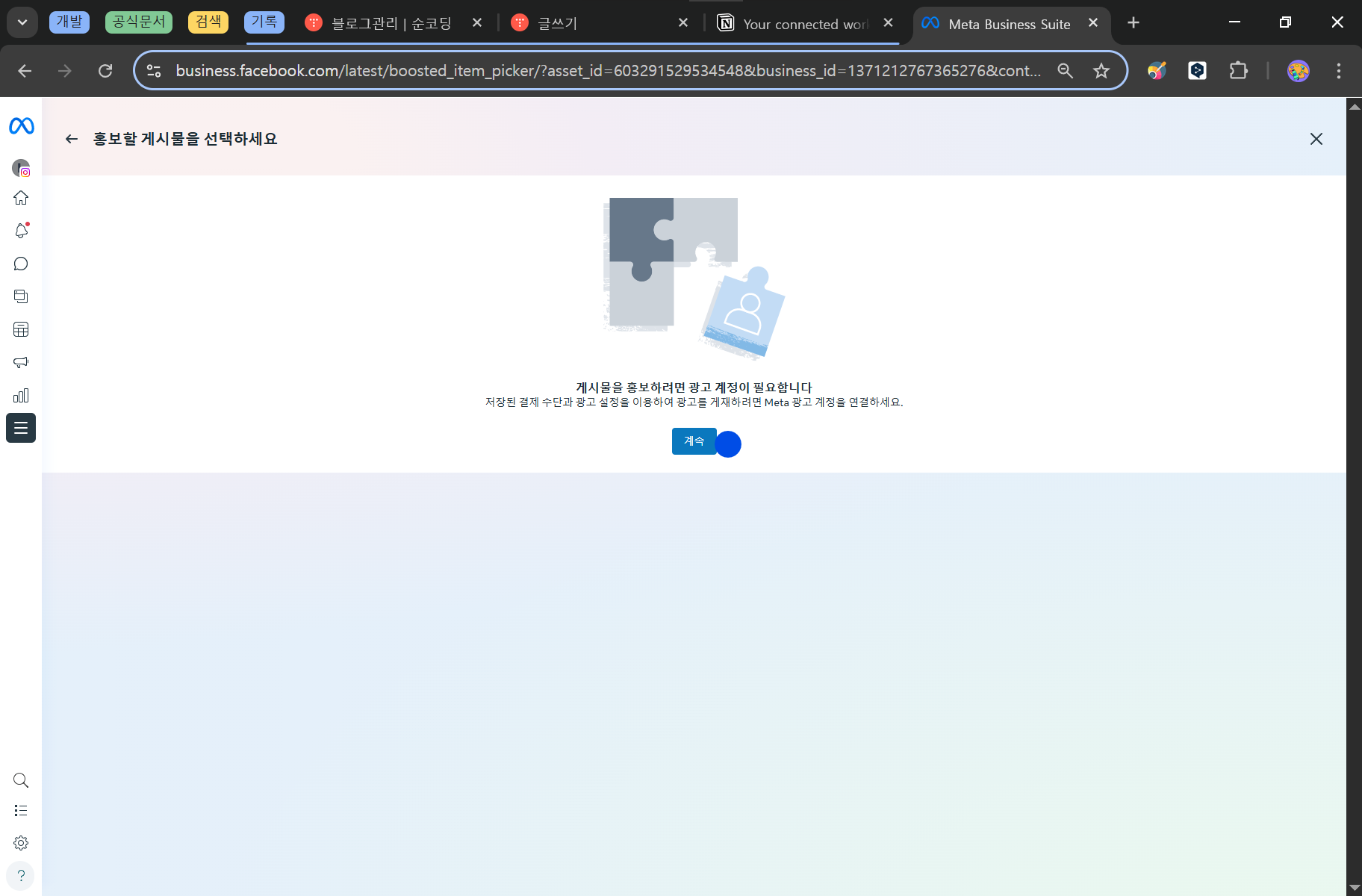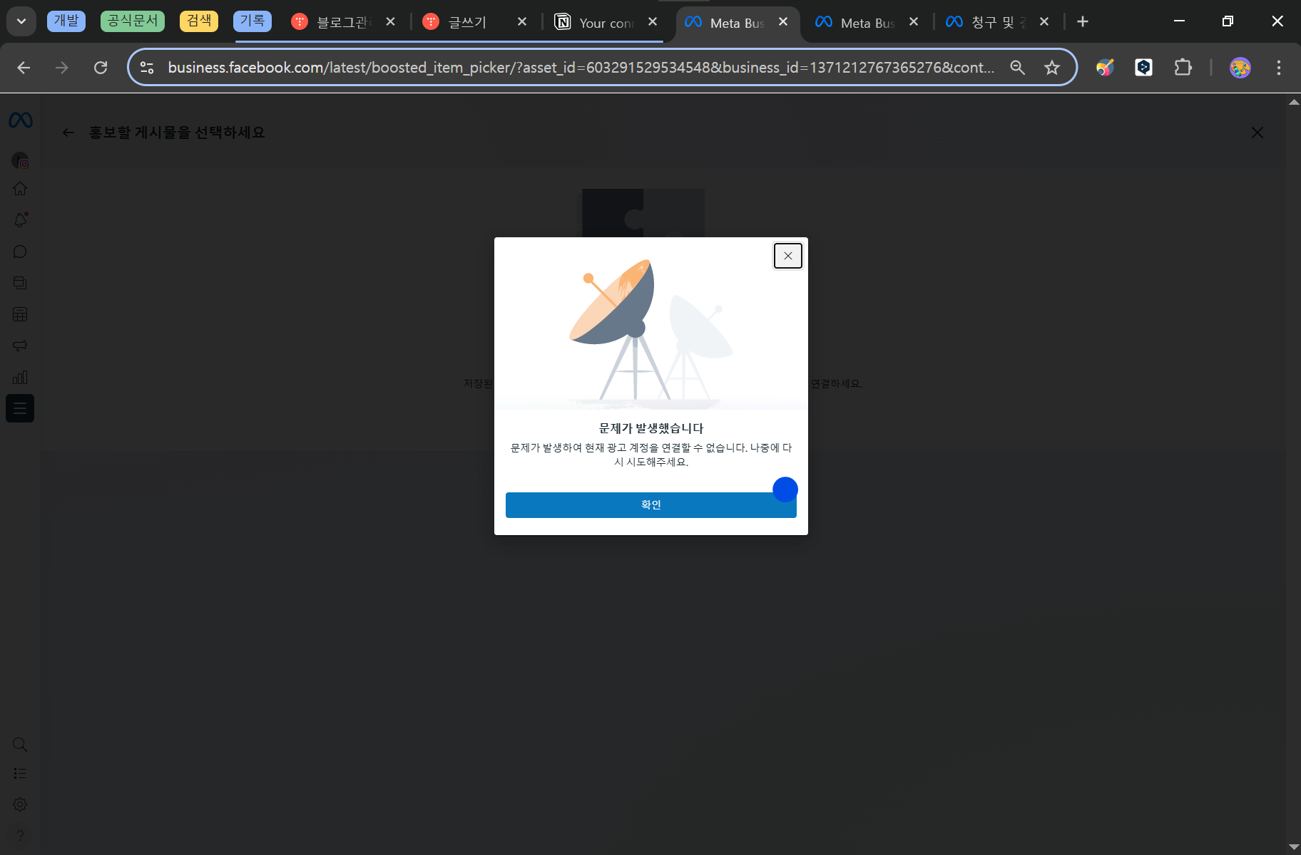 당황하지 않고 해당 창을 닫고 메타 비즈니스 페이지를 새로고침합니다.