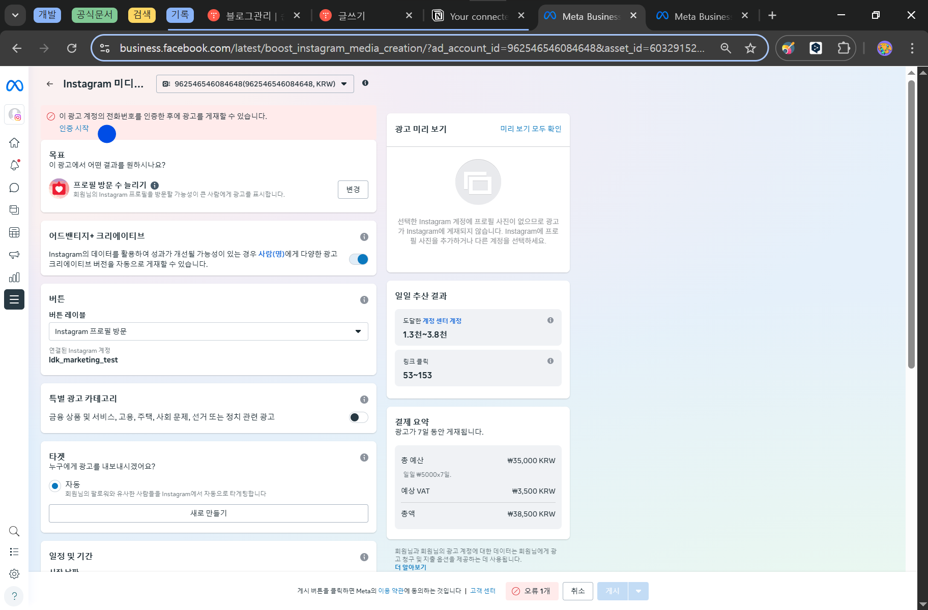 광고 설정 페이지에서 좌측 상단 전화번호도 인증합니다.