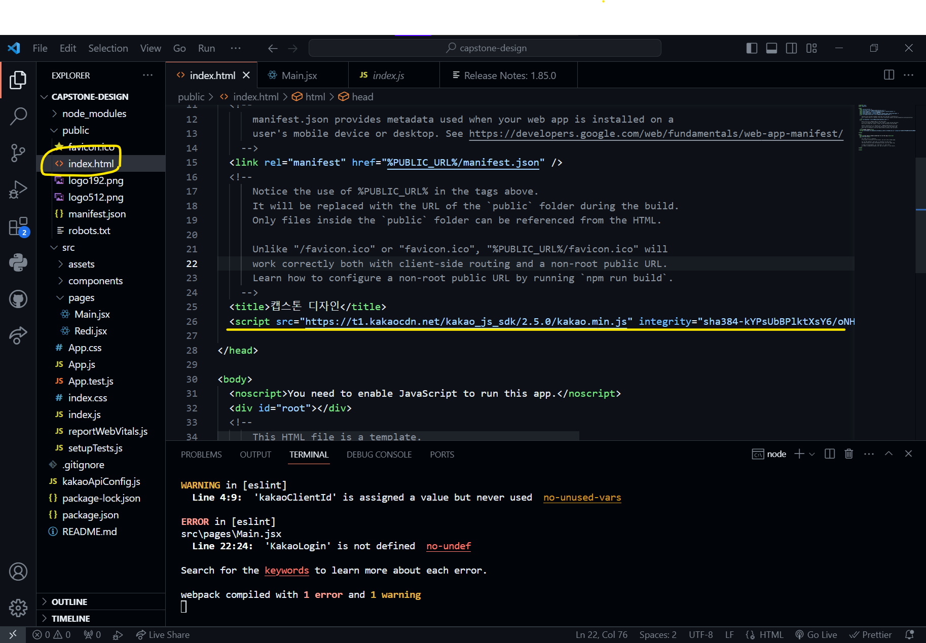 필자는 카카오 로그인 API 기능을 사용하기 위해 위 사진처럼 index.html에 javascript SDK 를 추가하였다.